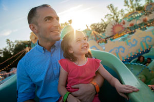 Fly high on a dinosaur around a twirling tin-toy top at this delightful carnival-inspired attraction.